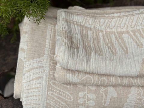 Với nguồn cảm hứng từ cỏ cây thiên nhiên , đặc biệt lấy cảm hứng từ hình ảnh lá dương xỉ – biểu tượng của sự bền bỉ và sức sống mãnh liệt giữa rừng sâu, họa tiết trên vải Linen Cotton Muslin không đến từ công nghệ in hay thêu, mà được hình thành bằng kỹ thuật dệt tinh xảo, kết hợp khéo léo hai tông màu mộc của cotton và linen. Đó là sự giao hòa giữa kỹ thuật truyền thống và tư duy thiết kế hiện đại, mang đến cảm giác mộc mạc nhưng không kém phần nghệ thuật.